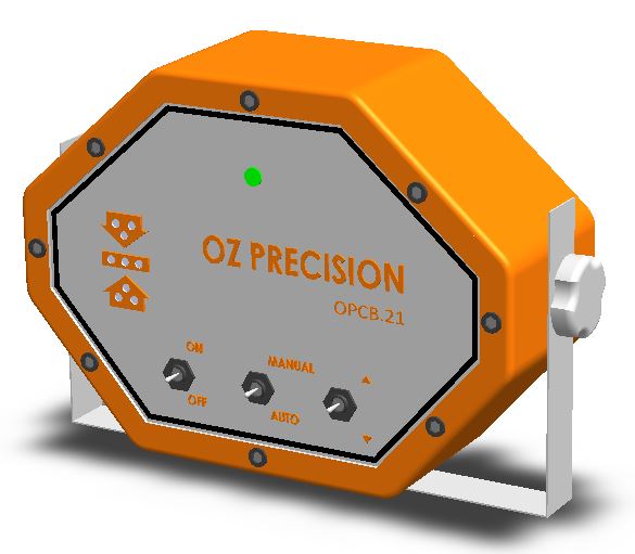 The OZAg.360 Laser machine control system from Oz precision is a simple single channel system with an electric output to control the PT solenoids of machinery. It consists of the OPCB.21 control box, connecting cables and the OPRC.005 360º laser receiver.